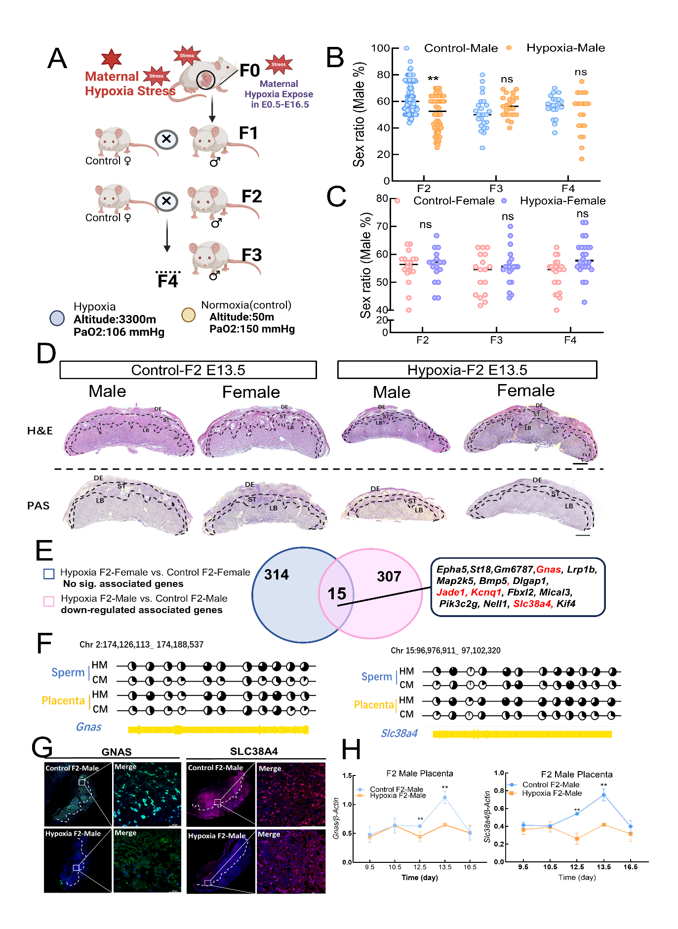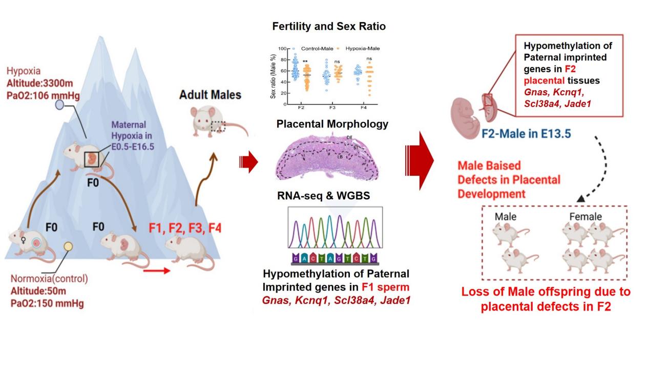 為探究母體低氧環(huán)境暴露對子代的跨代影響,中國科學(xué)院西北高原生物研究所動物生態(tài)與資源保護研究團隊建立了孕期低氧暴露小鼠模型,將經(jīng)歷過孕期低氧暴露的小鼠(F0)轉(zhuǎn)運至低海拔后,出生的雄性小鼠和對照雌鼠合籠,連續(xù)飼養(yǎng)四代(F1-F4)。從2018年 9月到 2023年 8月,通過大量出生性別統(tǒng)計和不同發(fā)育階段的性別鑒定,發(fā)現(xiàn)母體孕期低氧暴露會造成F2代雄性個體顯著減少。進一步的分析發(fā)現(xiàn)F2雄性減少是由于在胚胎期13.5天發(fā)生的胚胎特異性丟失。雄性胚胎丟失的主要原因為胎盤形態(tài)和功能異常。研究團隊通過胎盤轉(zhuǎn)錄組和全基因組DNA甲基化測序聯(lián)合分析,發(fā)現(xiàn)父源印記基因Slc38a4,Gnas,Jade1 和Kcnq1表達異常。隨后,通過對F1代小鼠成熟精子與F2代雄性胎盤全基因組DNA甲基化進行聯(lián)合分析,結(jié)果發(fā)現(xiàn)以上印記基因DNA甲基化模式高度相似。這說明經(jīng)歷胚胎期低氧的F1代雄性小鼠的精子存在甲基化異常,并且可以進一步影響F2雄性個體生長發(fā)育進而導(dǎo)致性別比例異常。該工作系統(tǒng)地揭示母體低氧暴露對F1及F2代發(fā)育影響的跨代遺傳機制,為深入理解高原低氧暴露的生殖和健康風(fēng)險提供了新的表型數(shù)據(jù)。